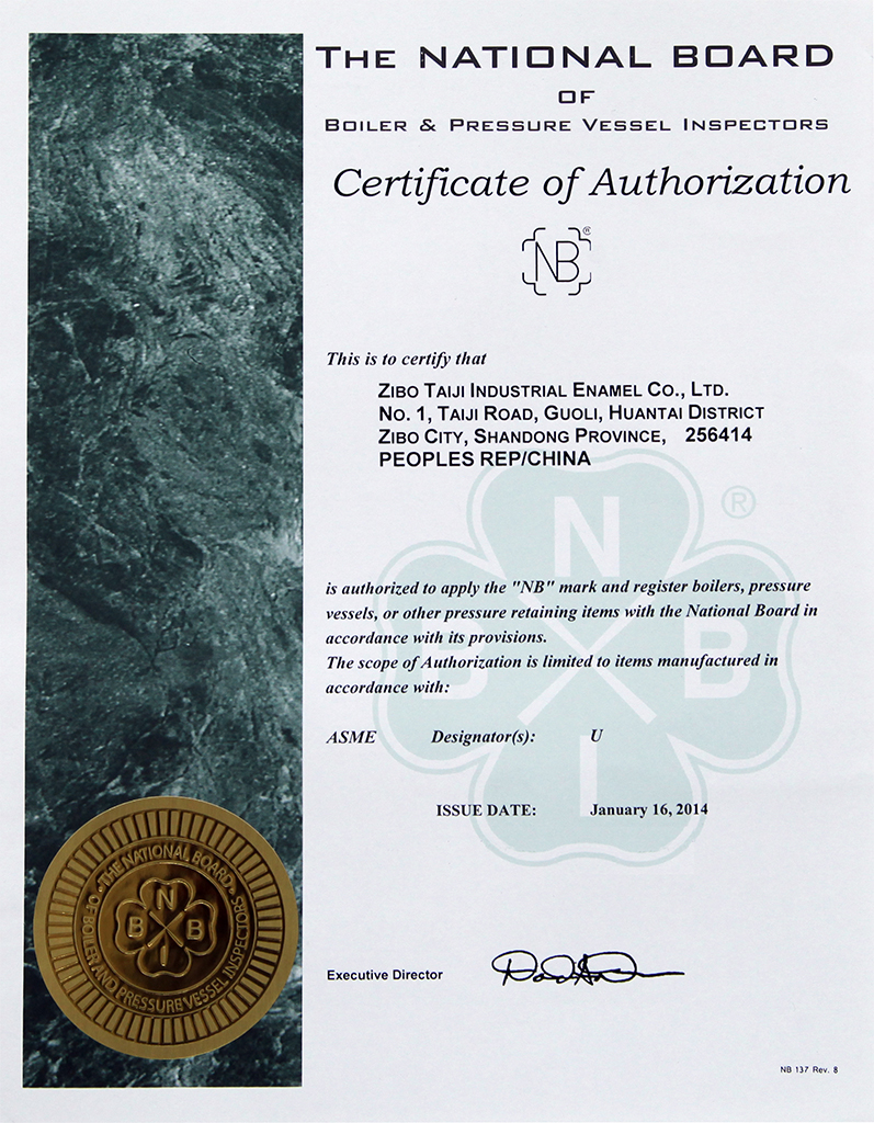 淄博太極在中國(guó)搪玻璃設(shè)備制造行業(yè)中首家通過(guò)ISO90001質(zhì)量體系認(rèn)證,并擁有美國(guó)ASME認(rèn)證、歐洲PED認(rèn)證以及國(guó)家部門(mén)頒發(fā)的搪玻璃制造許可證、進(jìn)出口許可證和百余項(xiàng)榮譽(yù)證以及三十六項(xiàng)專(zhuān)利等。